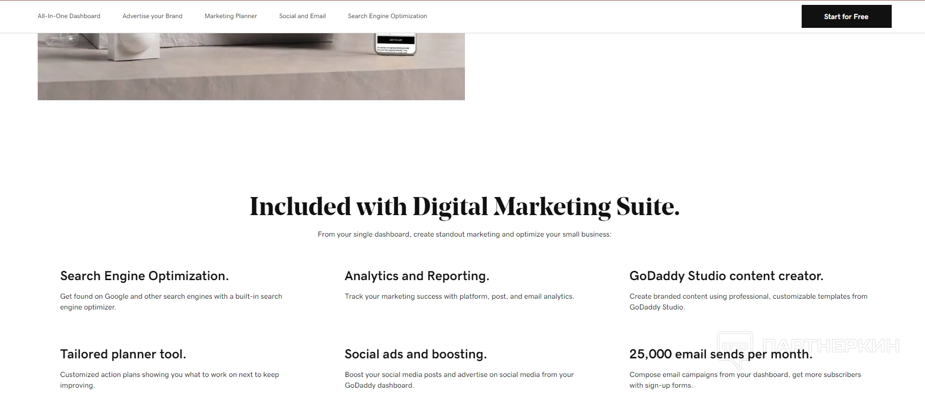 Пакет цифрового маркетинга — в этом подразделе можно значительно усилить присутствие своего бренда в Сети. Для этого система также предложит создать сайт или использовать тот, который пользователь уже сделал. На панели конструктора можно использовать некоторые seo-инструменты для улучшения ранжирования, а также регулярно получать аналитические данные о продвижении сайта.