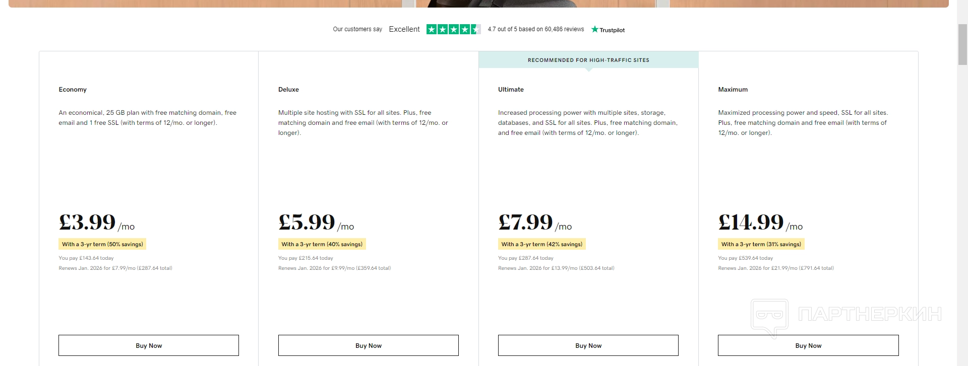 - Economy — при оплате тарифа пользователь получает 25 ГБ памяти, бесплатный домен, бесплатный SSL и две бесплатных почты. Но здесь поддерживается только один сайт, а также ограничено количество баз данных;