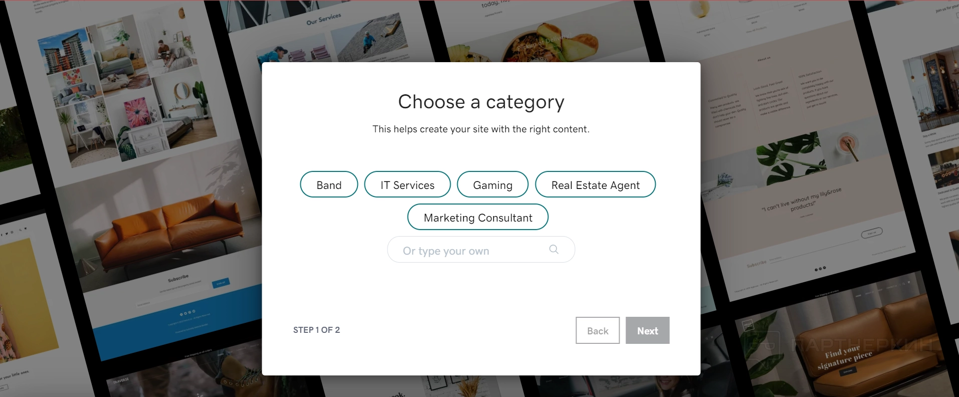 После перехода в конструктор пользователю нужно определить, какая категория будет у его будущего сайта: группа, IT-услуги, игры, агентство по недвижимости или агентство маркетинга. По необходимости, можно добавить свою категорию.