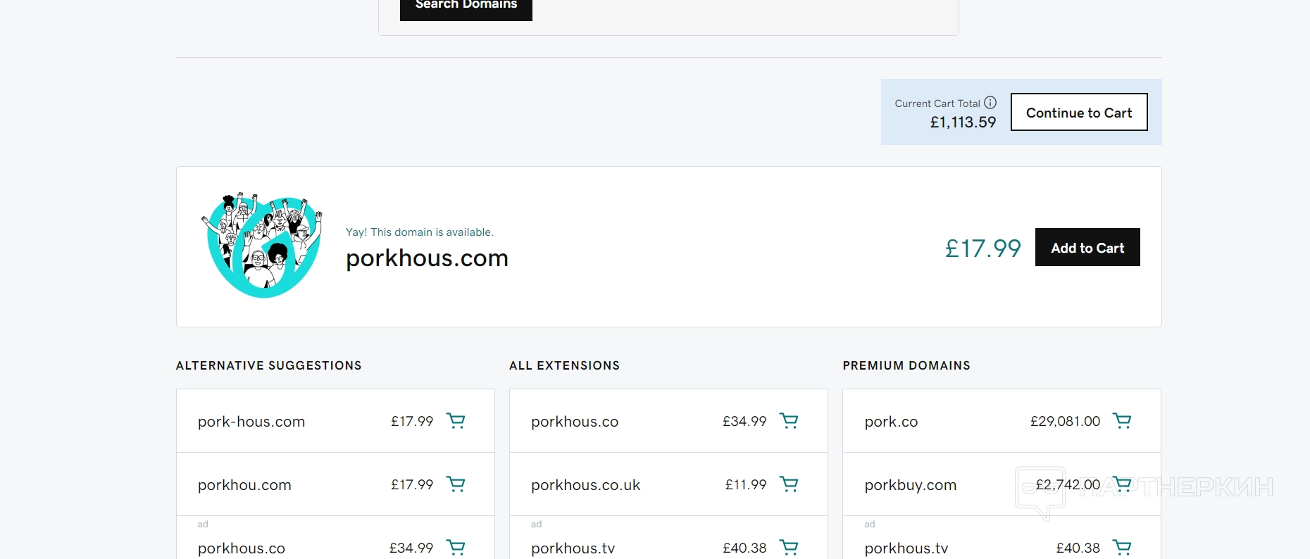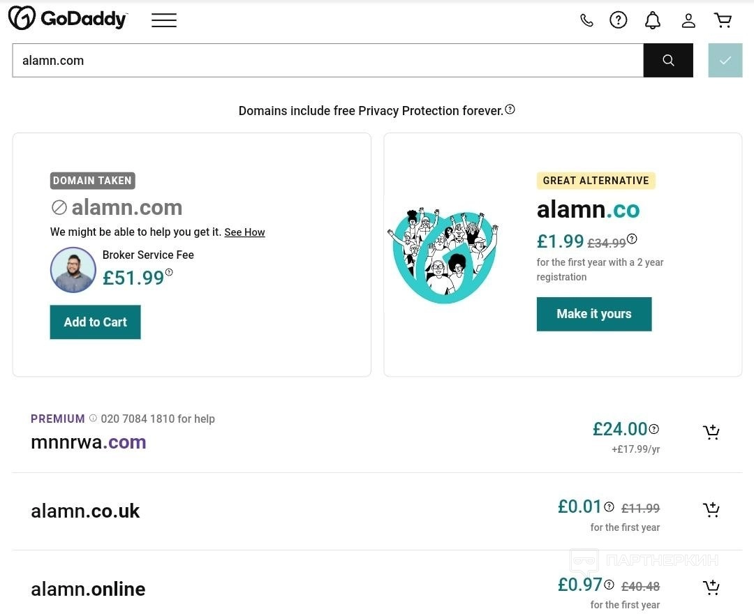 Для поиска достаточно вбить ключевую фразу или полноценный домен, и если он свободен, система оповестит пользователя и предложит его купить. Там же отобразятся и похожие домены, в том числе и премиальные.