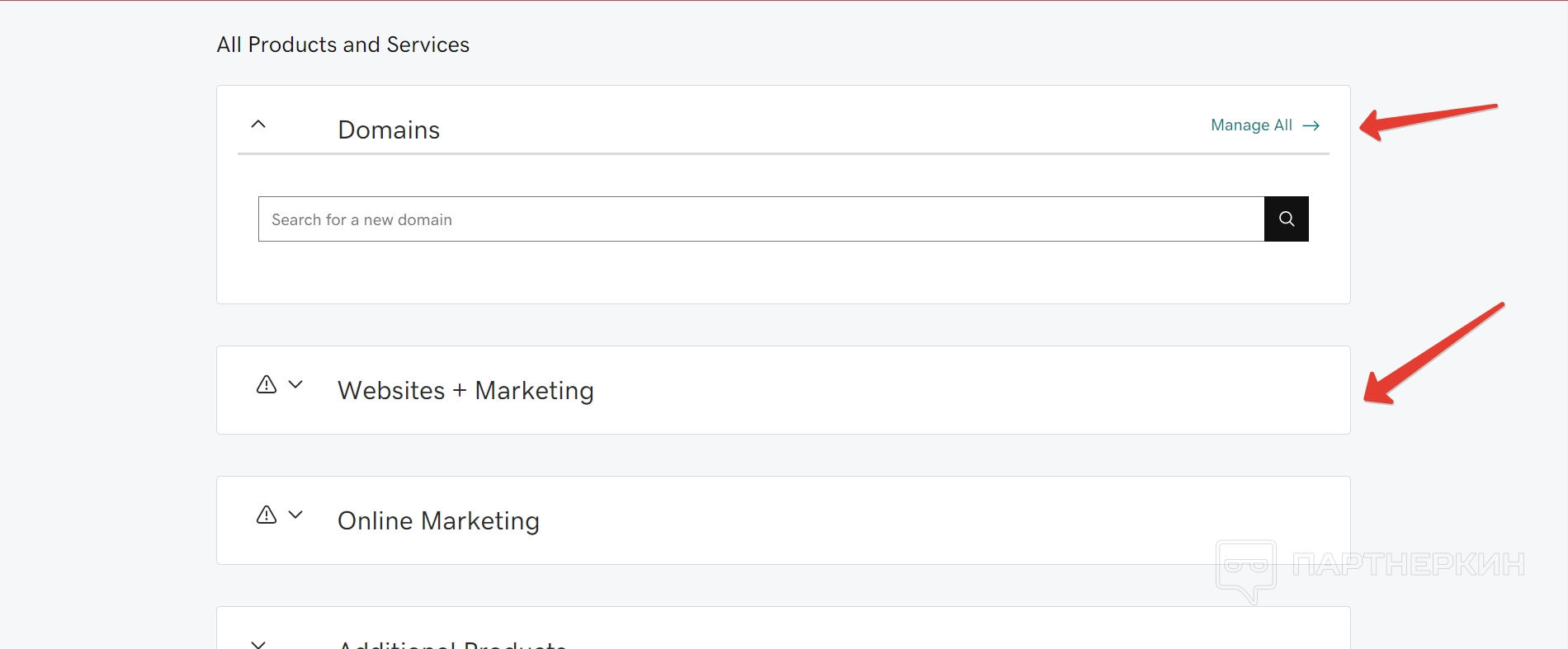 Ниже также показывают активные проекты, но по категориям — сначала домены, потом веб-сайты, далее маркетинговые услуги и дополнительные продукты. Достаточно тапнуть на каждый раздел, чтобы проверить свой продукт.