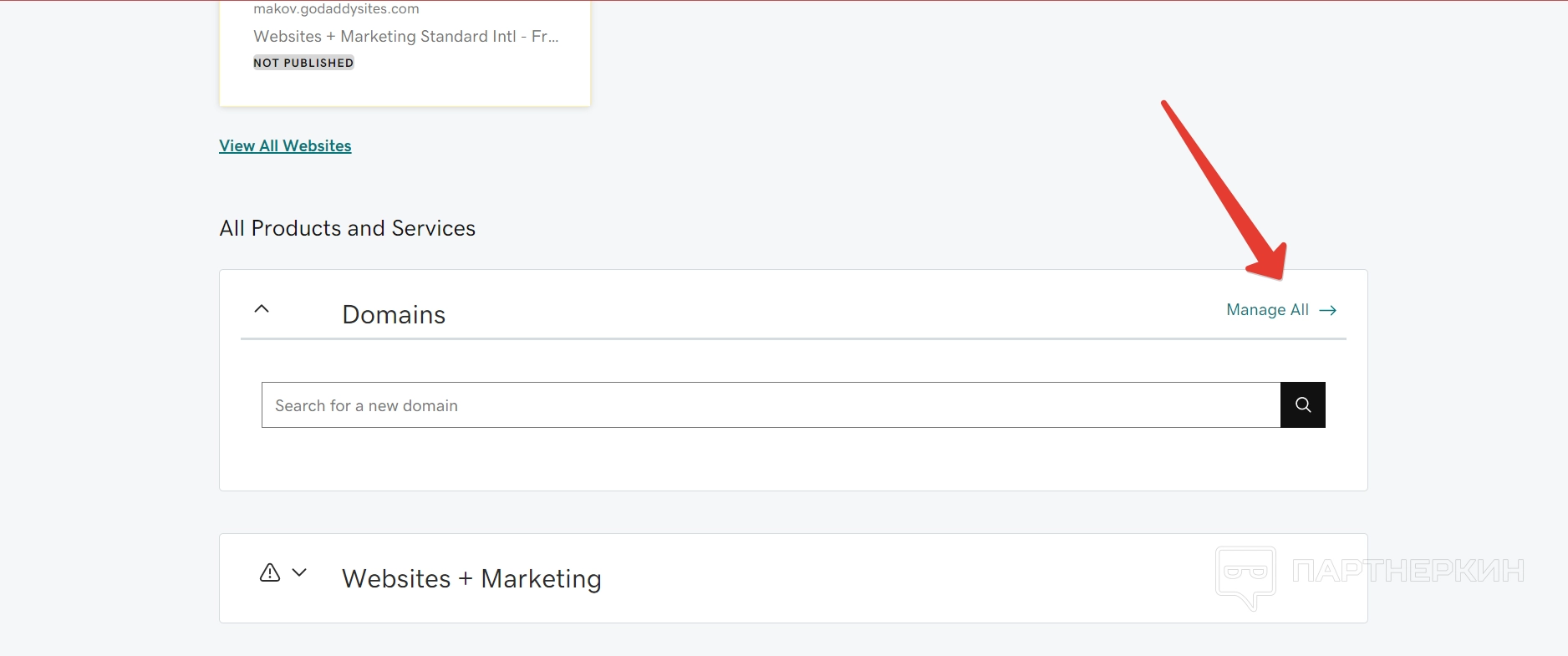 Из кабинета пользователя можно перейти в дополнительное меню управления доменами и другими услугами. Для этого нужно тапнуть на «Manage All», и перед пользователем откроется новая панель.