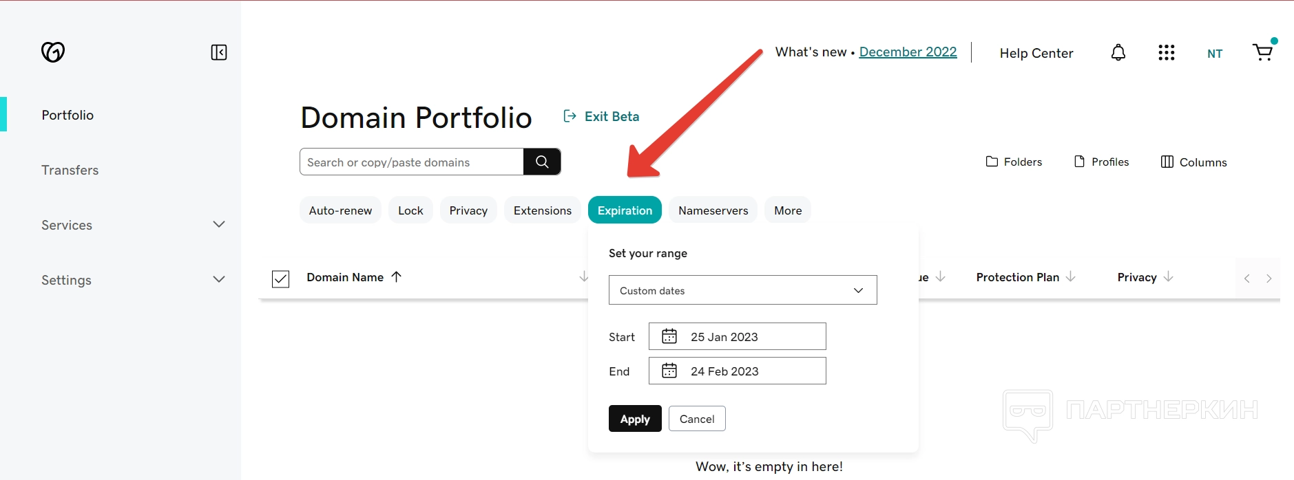 Портфолио доменов — это список всех активных доменов, которые приобретал пользователь. Здесь показывается само название домена, срок его действия, расчетная стоимость в случае продажи, конфиденциальность и план защиты. Показы в таблице можно настроить — достаточно в фильтрах отметить нужные характеристики, и система отобразит только те домены, которые по ним проходят.