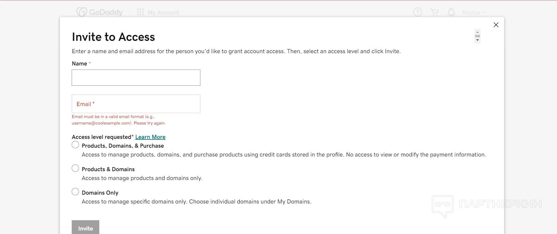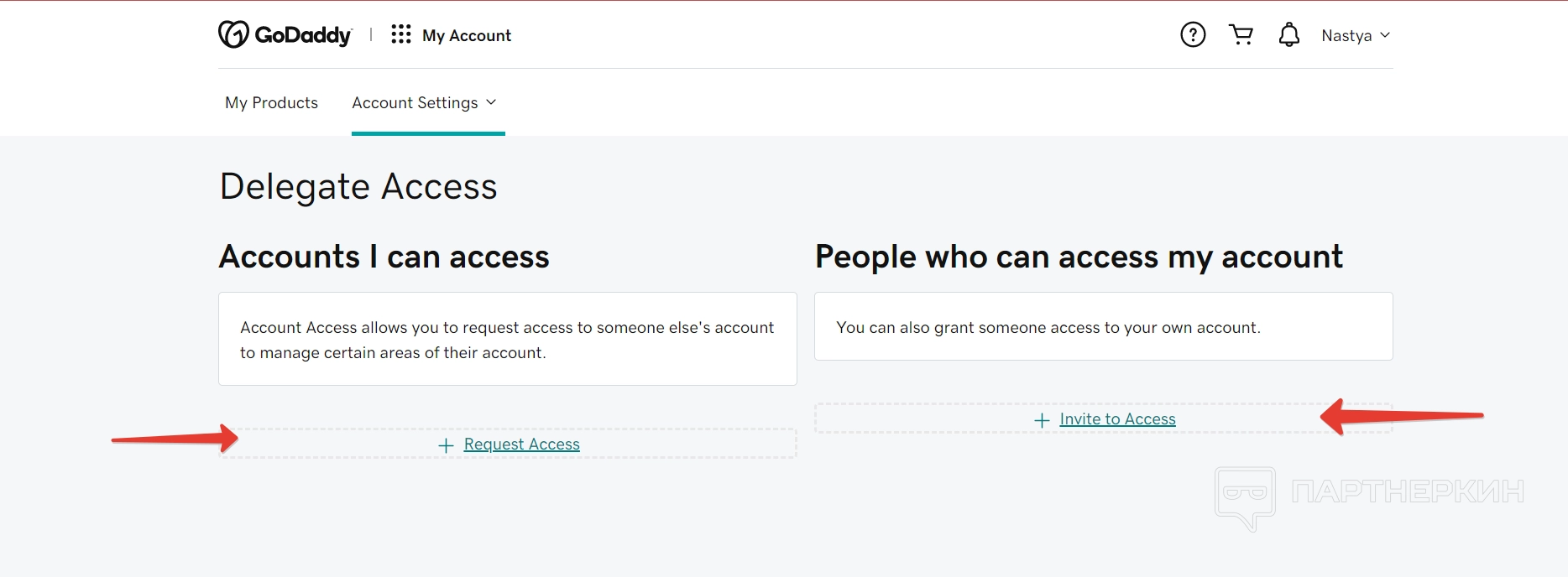 - делегирование доступа — здесь пользователи могут запрашивать доступ, а также его предоставлять. Функция чаще полезна тем, кто работает над проектами с коллегами — все они будут иметь доступ к продуктам, которые приобретал владелец учетной записи. И, наоборот, если пользователя подключат к аккаунту, то он получит доступ к продуктам этого аккаунта. Чтобы предоставить или запросить доступ, нужно знать никнейм пользователя, а также его электронную почту. При запросе в обоих случаях можно указать, на что именно дается или запрашивается доступ — продукты, домены и покупки, домены и продукты или только домены;