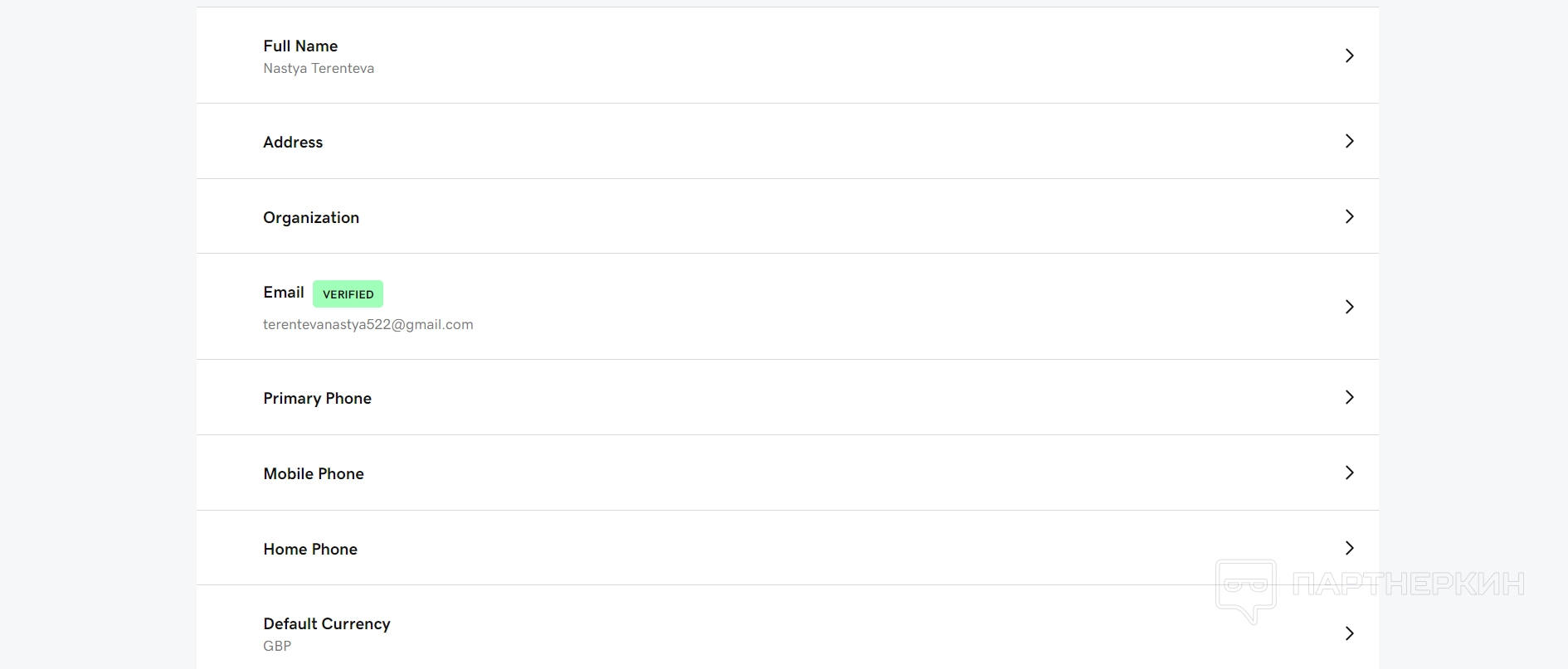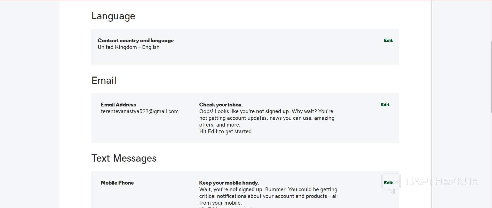 Контактные данные — здесь можно настроить получение рассылки от сервиса. Пользователь может изменить свою страну и язык, указать другую электронную почту, настроить получение сообщений или звонков на мобильный номер телефона, а также подключить WhatsApp. Кроме того, раздел позволяет настроить адрес своего проживания и изменить настройки конфиденциальности.