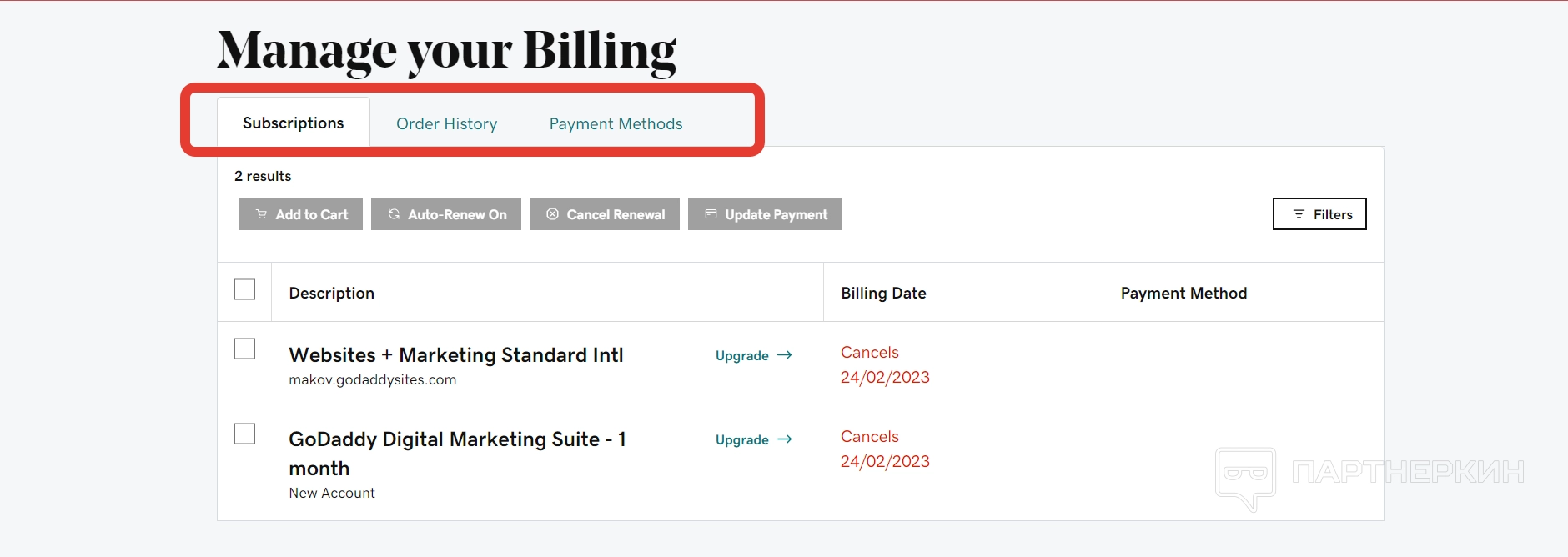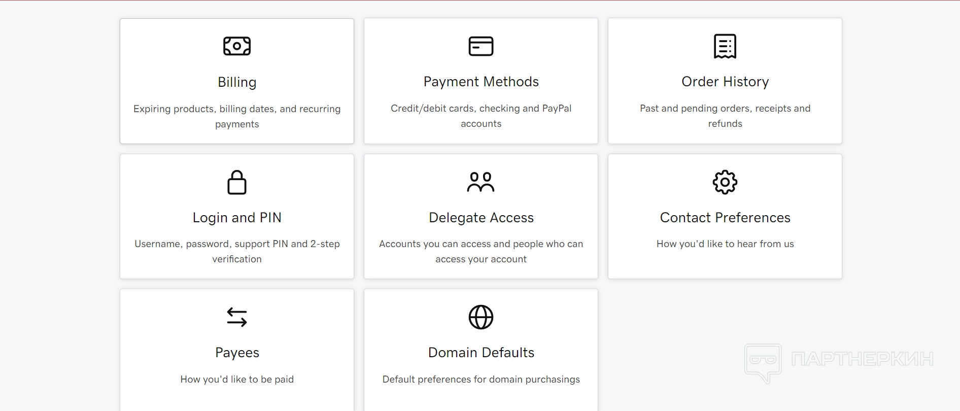 Выставление счетов — в этом разделе отображаются все услуги пользователя, которые он использовал. Также указывается срок их оплаты. Все платежи можно сделать автоматическими, а также отменить их продление по желанию. Кроме того, в разделе можно посмотреть всю историю заказов и указать способы оплаты — на выбор дается либо оплата кредитной картой, либо по системе PayPal. Все способы оплаты сохраняются в этом подразделе.