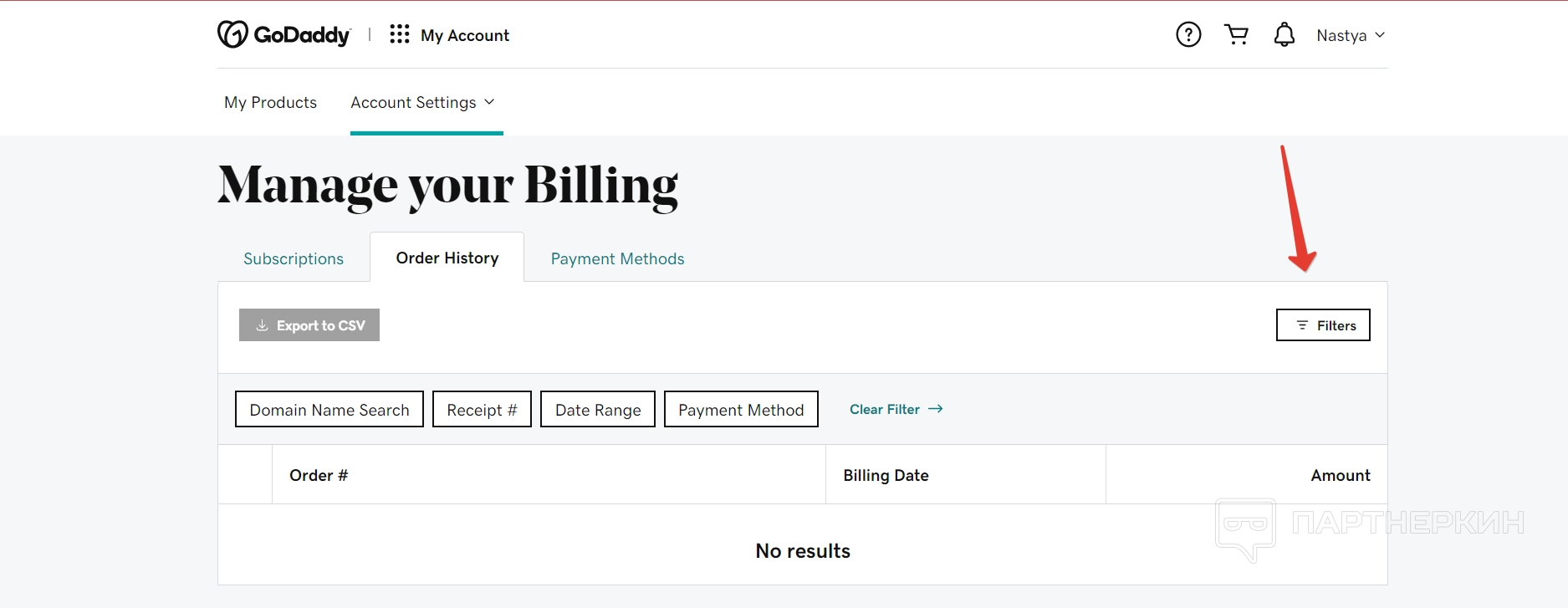 История заказов — также дубль предыдущего раздела, так как пересылает в меню выставления счетов. В истории отображаются все старые заказы пользователя, которые уже не активны. Если хочется найти определенный, достаточно использовать фильтр.