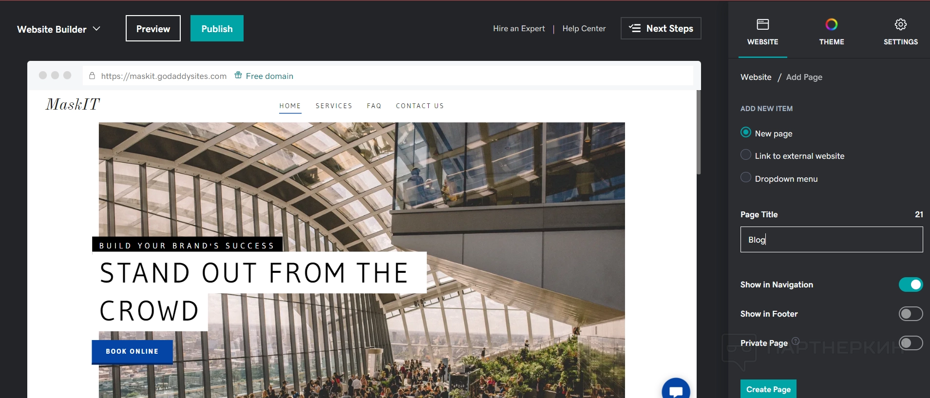 По умолчанию у сайта будет пять страниц — домашняя, услуги, FAQ, контакты и политика конфиденциальности. Но этого недостаточно — нужен еще один раздел с блогом, в котором будут публиковаться кейсы. Чтобы создать еще одну страницу, нужно тапнуть по плюсу с правой стороны и потом указать тип страницы и ее название. По желанию, можно страницу сделать приватной, отобразить ее в футере сайта или добавить в основное меню навигации.