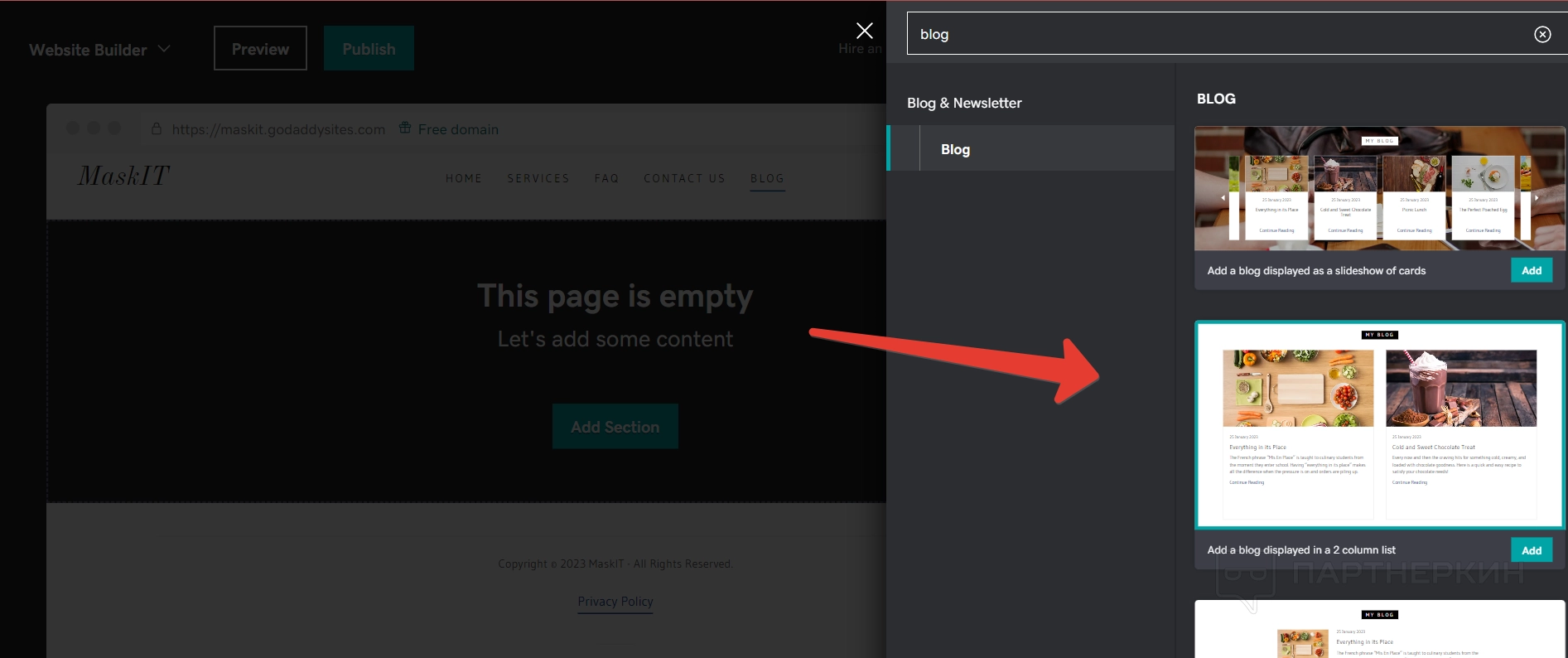 К счастью, среди шаблонов сайта есть шаблоны для блога — мы использовали один из них.