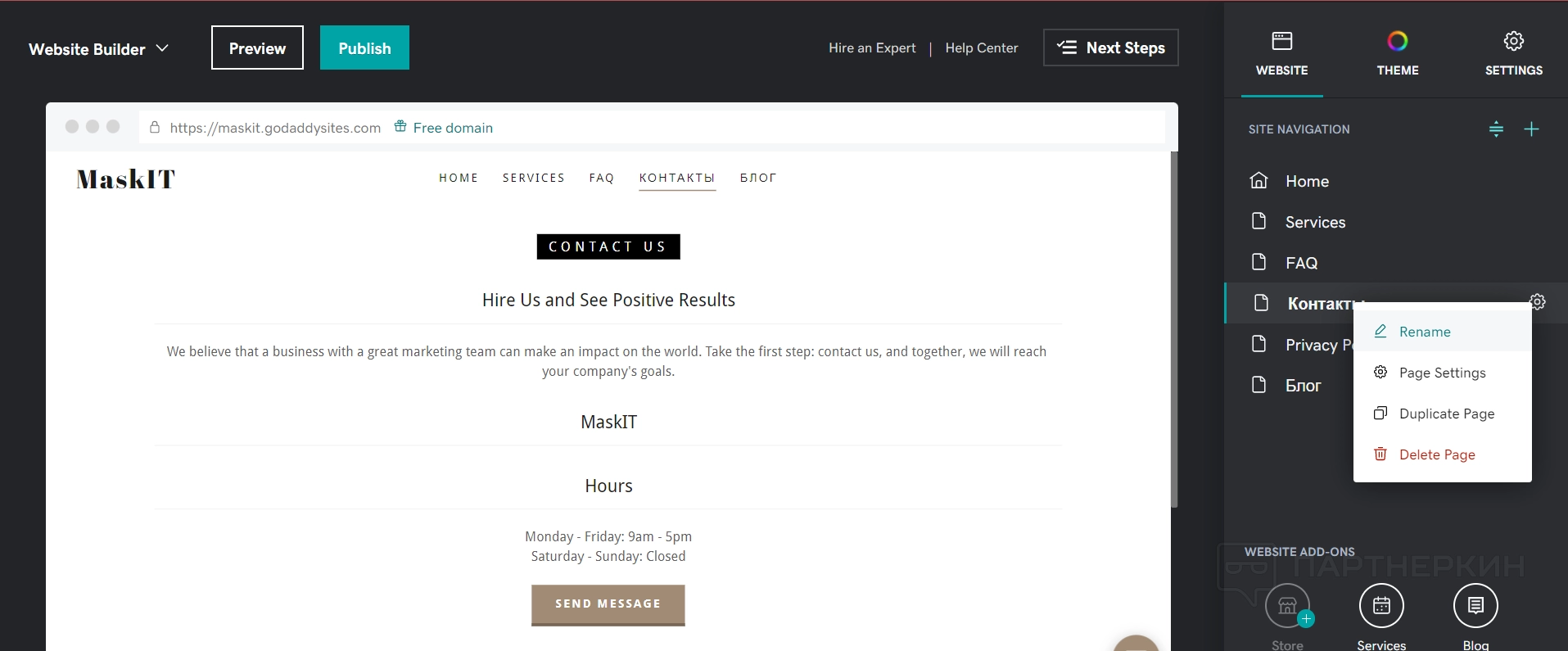 Остальные страницы редактируются по такой же логике — шаблонов и вариантов оформления очень много, поэтому проблем с редактированием и созданием сайта не возникнет. Теперь остается одно — подключить сайт к нашему домену, так как по умолчанию он будет иметь домен сервиса.