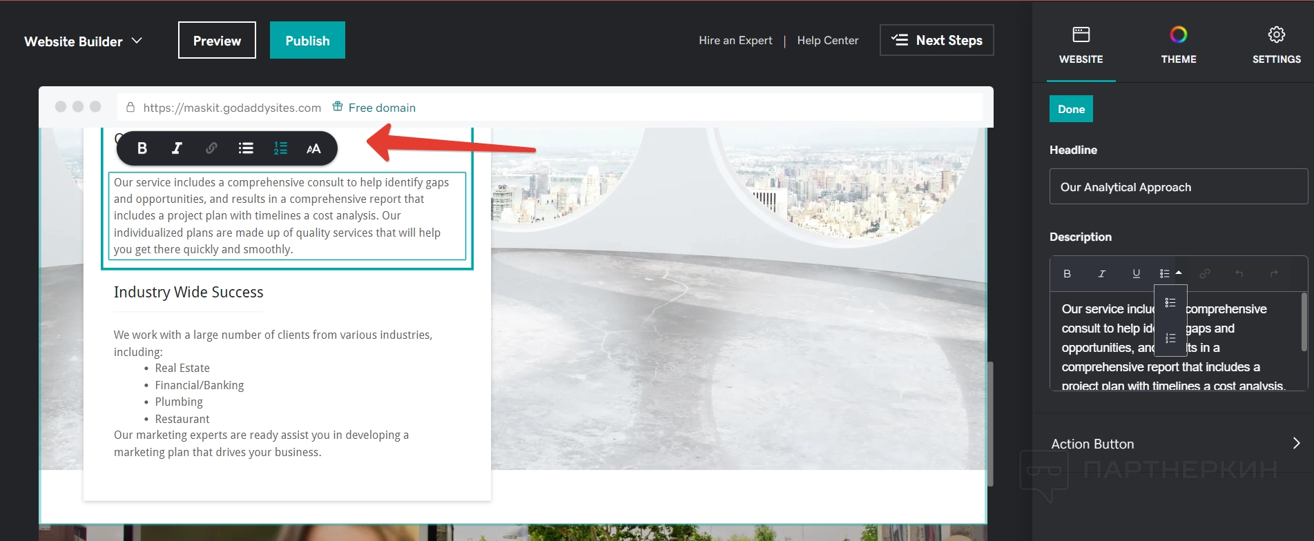 Далее нужно изменить остальные блоки главной страницы. Можно начать с информации об агентстве — добавить свой текст, а также поменять оформление, так как в шаблоне уже есть такой блок. Для этого пойдем по такой же логике — выбираем фрагмент с текстом и вставляем нужный. При редактировании текста можно использовать вспомогательное меню сверху — там регулируется размер самого текста, вставляются ссылки, увеличивается жирность или добавляется курсив.