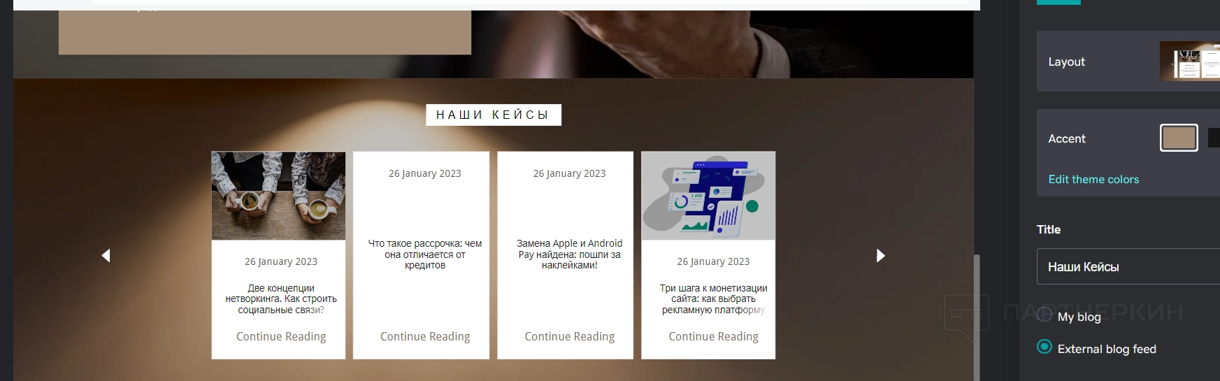 Следующий блок будет в виде простого списка из различных кейсов, чтобы показать результаты работы агентства. Для этого добавляем новый шаблон. После корректируем текст и фото, а также заливаем сами тексты для кейсов. Редактирование проходит по такой же логике, как редактирование раздела «Блог». В итоге получается удобная мини-галерея с кейсами, которые могут почитать клиенты.