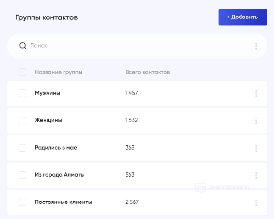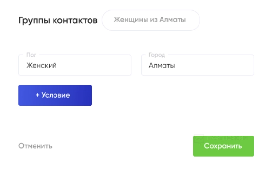Сервис «Менеджер контактов» позволяет работать с клиентской базой, добавлять контакты пользователей, оперативно оповещать их. Можно хранить историю коммуникации с каждым клиентом и сегментировать аудиторию по группам для повышения ROI.