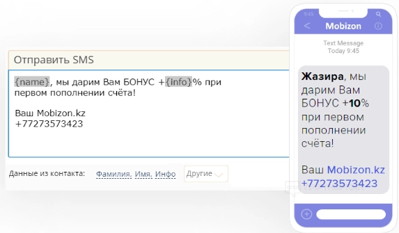 • Персонализация сообщений. Во время отправки сообщения можно добавить любые данные: имя, фамилию, персональную скидку, дату рождения.