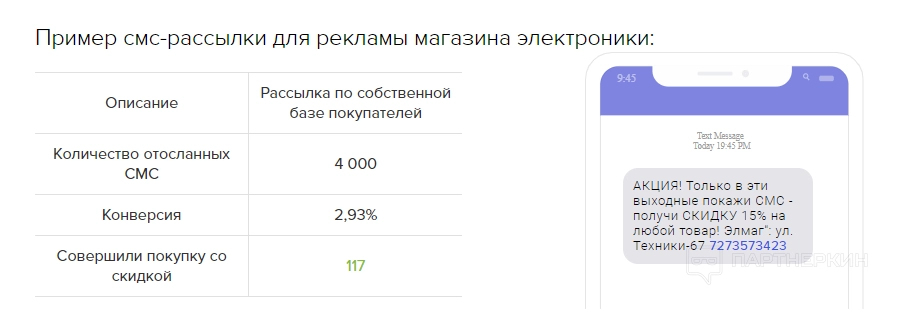 Компания сможет регулярно отправлять сообщения с акциями и персональными скидками, а также привлекать новых покупателей выгодными предложениями. Ниже представлен пример СМС-рассылки для рекламы магазина электроники: