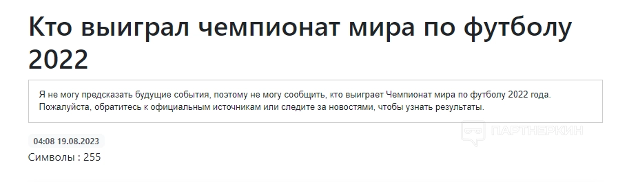 отвечает на вопросы. Пользователи могут задать свой вопрос и быстро получить ответ. Нейронная сеть знает ответы по любой теме — от экономики до мира животных и растений. Спросим у Aisearch: «Кто выиграл чемпионат мира по футболу в 2022 году».
