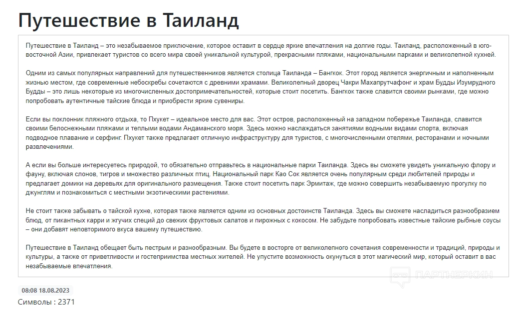 написать текст на тему «Путешествие в Таиланд». Через 30 секунд нейронная сеть выдала следующий результат: