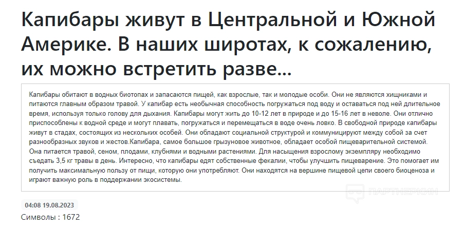 Для анализа работы инструмента возьмем рандомный текст про капибар. Результат получился следующим: