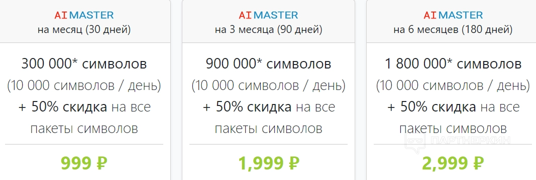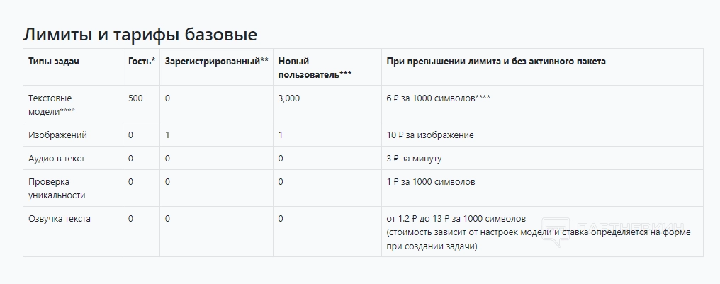 Оплата подключения пакета производится с баланса пользователя. Для подключения пакета услуг стоит убедиться, что на балансе достаточно средств. После активации пакета в личном кабинете появится уведомление о действующем пакете с указанием времени действия. Символы в текстовых моделях учитываются как в запросе, так и в ответе (и влияют на стоимость).