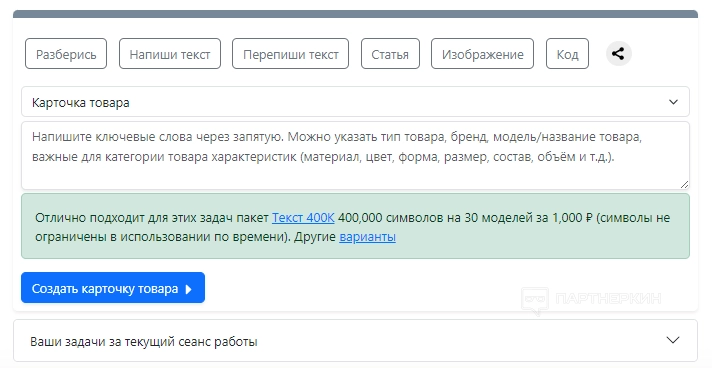 Нейронная сеть подходит для создания описания карточки товара на маркетплейсах Wildberries, Ozon и Яндекс.Маркет. Заполнение карточек вручную отнимает много времени. Для привлечения покупателей и улучшения позиций можно использовать