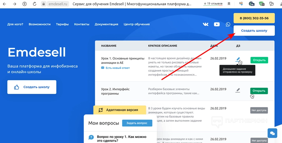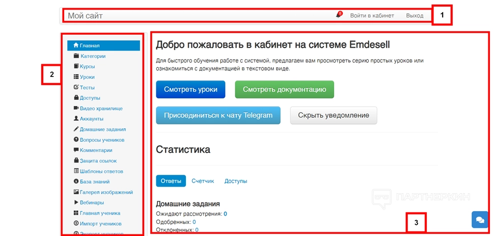 Интерфейс школы выглядит просто. В верхней части страницы располагаются уведомления, доступ к готовым обучающим материалам и кнопка выхода из личного кабинета (1).