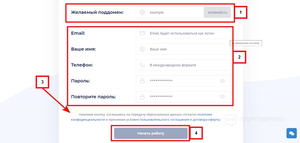 - Придумайте желаемый поддомен (1). Это URL личного кабинета. Выглядит следующим образом: название поддомена.emdesell.ru. Например, myschool.emdesell.ru.