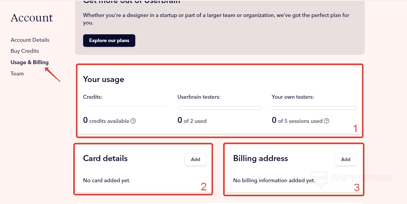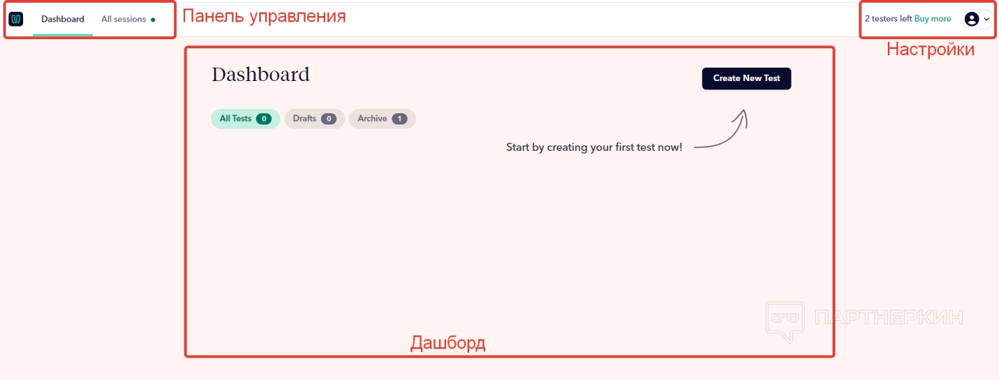 После регистрации пользователь попадет в личный кабинет, где сможет проводить тестирования для оценивания юзабилити сайта. Интерфейс в сервисе крайне простой и удобный. Состоит из дашборда, маленькой панели управлении, где всего 2 раздела, и блока с настройками аккаунта.