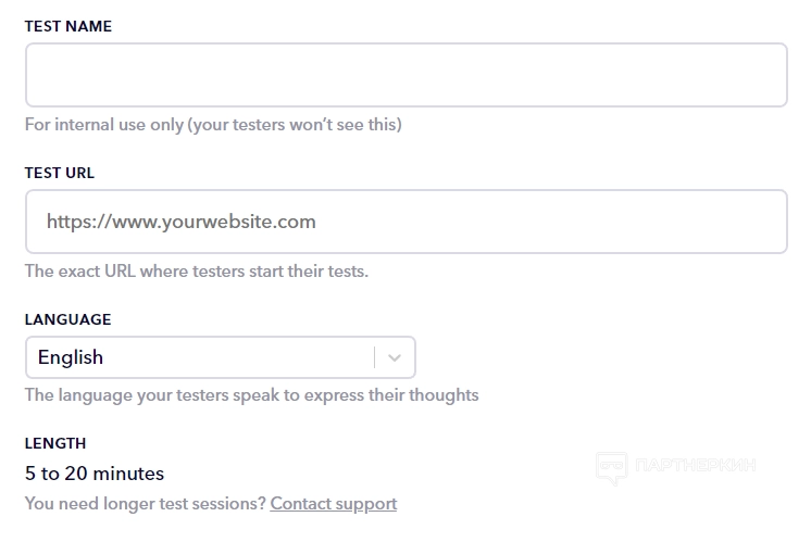 Откроется страница, где нужно заполнить несколько блоков. В первом блоке указываем название теста, вводим адрес сайта, где будет оцениваться юзабилити и выбираем язык, на котором тестировщики смогут выбирать свои мысли. Поддерживаются английский, немецкий и испанский языки.