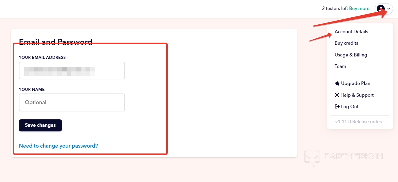 Чтобы попасть в настройки, жмем на аватарку в правом верхнем углу и выбираем вкладку «Данные учетной записи». В открывшейся форме можно изменить электронную почту и название аккаунта.