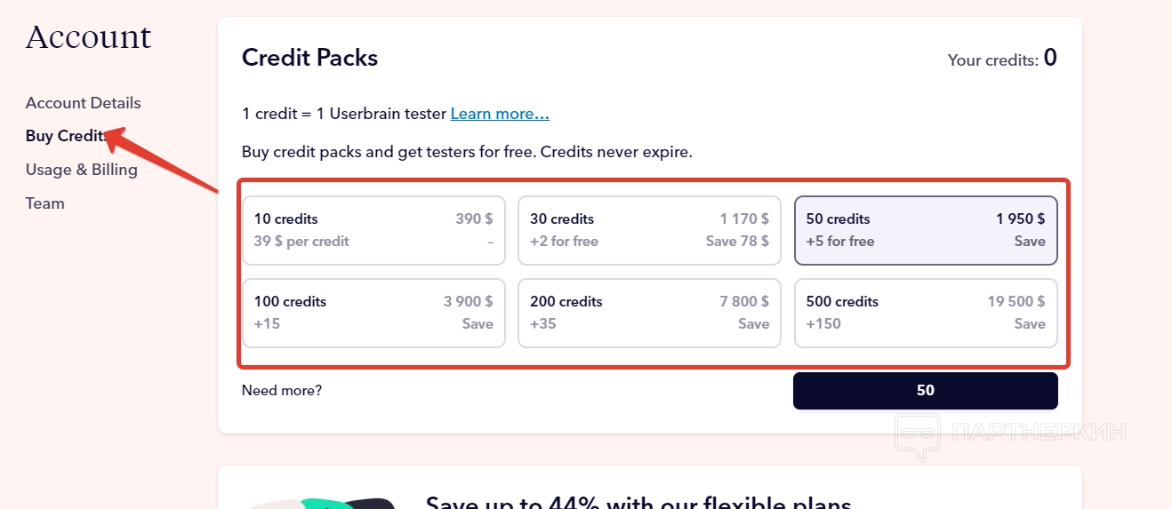 Во вкладке «Покупка кредитов» юзер может покупать кредиты, которые нужны для оплаты услуг тестировщиков. Оплата осуществляется по схеме 1 кредит за 1 тестировщика.
