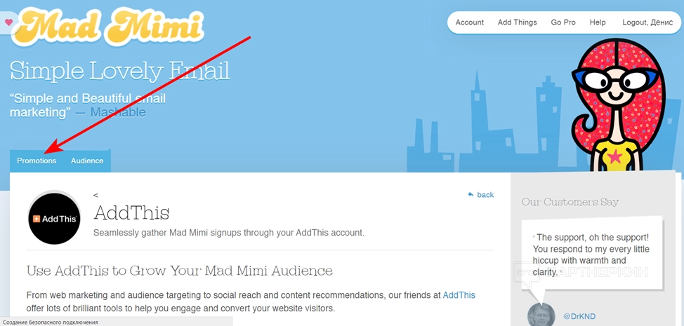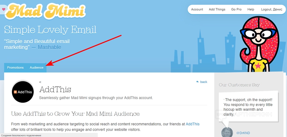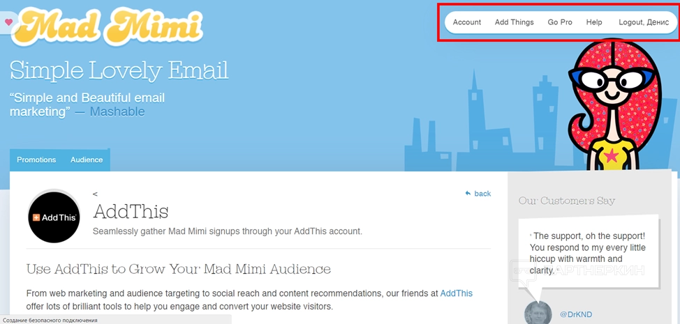 Рассылку делают через личный кабинет. В зависимости от тарифного плана пользователь может привязать определенное количество подписчиков и выполнять рассылки писем. Также можно подключить дополнительные опции через сервис партнеров AddThis и раздел Add Things.
