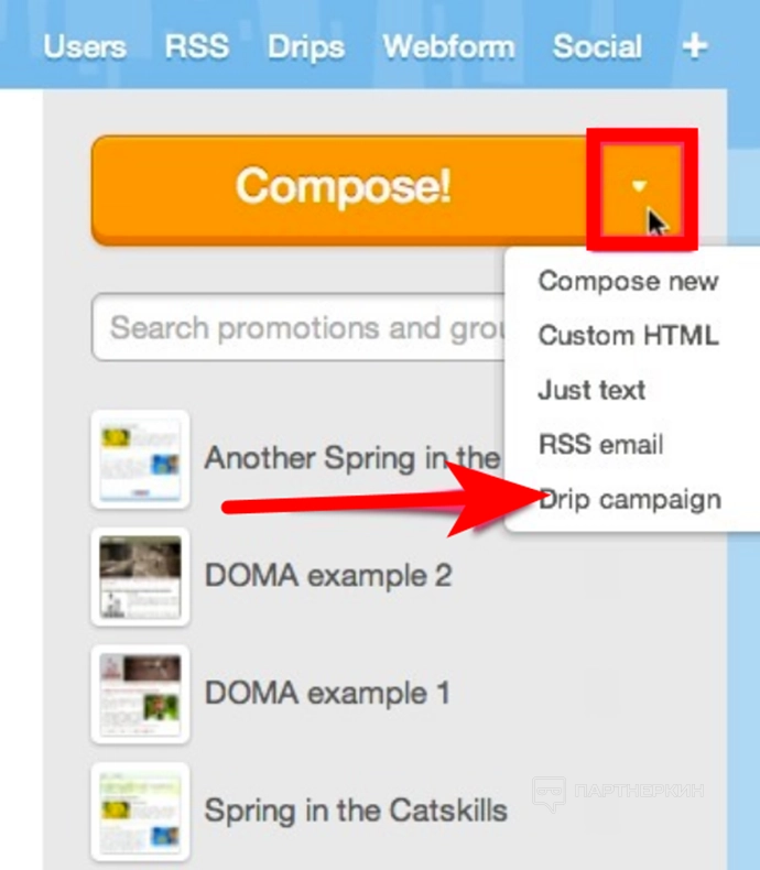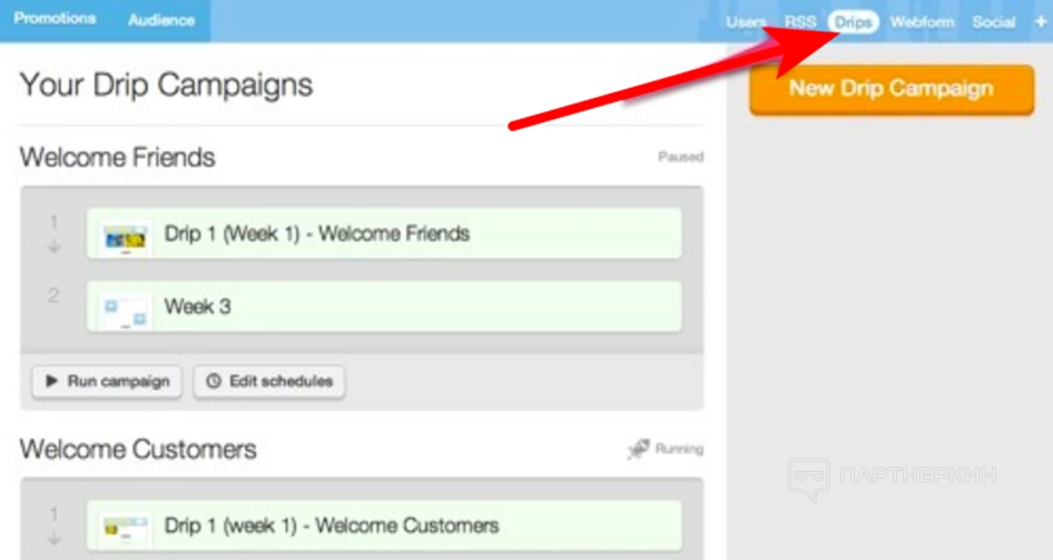 Создание писем, которые будут отправлены сразу после регистрации подписчика. Drip-кампания работает следующим образом. Пользователь создает рекламную акцию (Promotion). Дальше задаются интервалы рассылки (1, 5 дней или 1 неделя). Когда подписчик регистрируется,