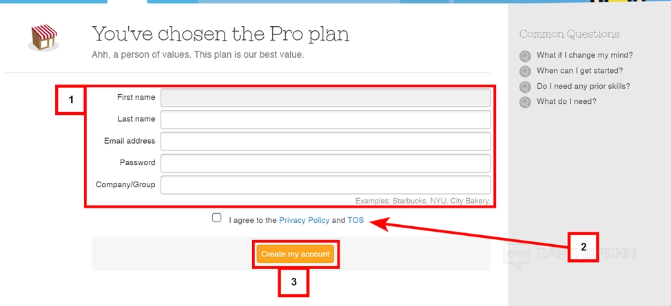- Заполните форму (1). Укажите имя и фамилию. Также введите адрес электронной почты, придумайте пароль и добавьте название компании.