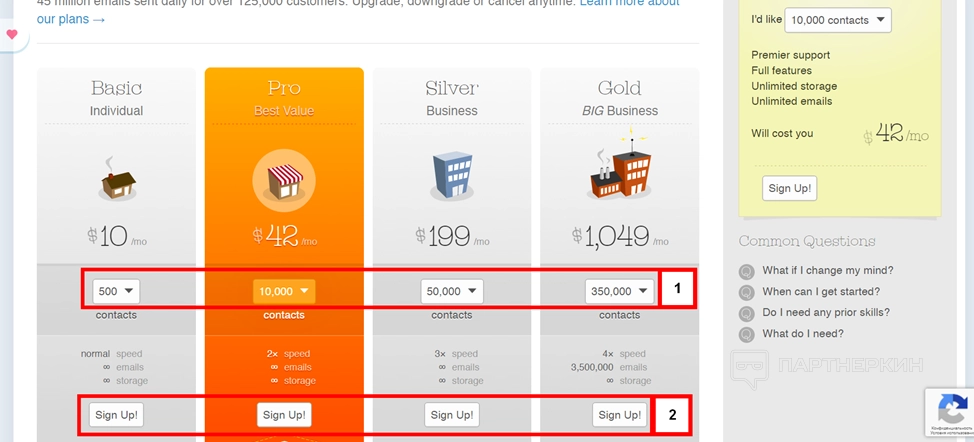 - Под тарифом выберите количество подписчиков (1). Стоимость сразу поменяется. Нажмите на кнопку «Зарегистрируйтесь» (2).