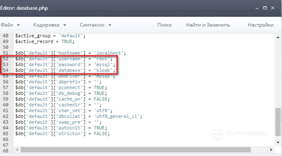 • Когда архив распакован, выберите папку «application/config». В ней найдите файл database.php. там нужно прописать вручную следующие строки после знака «=»: 52 (Username) — логин хостинга Beget, 53 (Password) — пароль хостинга Beget, 54 (database) — имя базы данных. После изменения файла, его нужно сохранить.