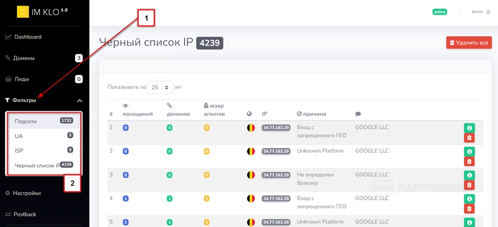 • Фильтры (1). Настройка клоаки под разные сервисы и параметры. Например, можно выбрать регион, маску подсети или ISP. Также здесь можно добавлять черный список IP (2).