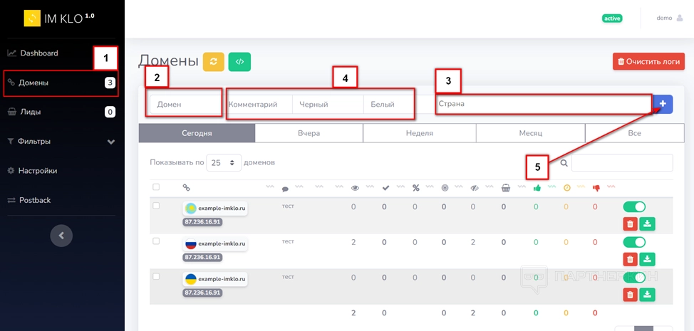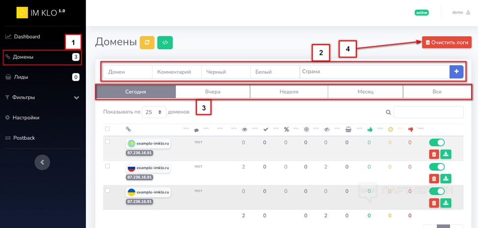 • Домены (1). Настройка подключаемых страниц и генерация кросс-кода для добавления в клоаку. Чтобы добавить новый домен, нужно заполнить форму (2), указав адрес, комментарий, черный и белый оффер, выбрать страну. Также все домены можно разбить по датам (3). Дополнительно есть кнопка для очистки логов (4). Последнюю процедуру нужно выполнять периодически, чтобы клоака не тормозила.