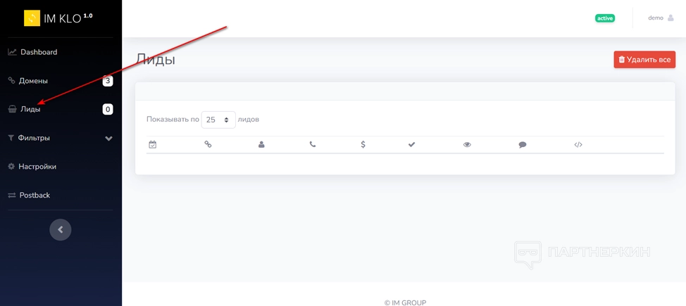 • Лиды (хранение лидов). Страница отображает потенциально привлеченных клиентов.