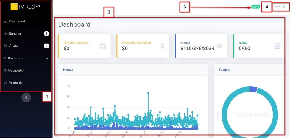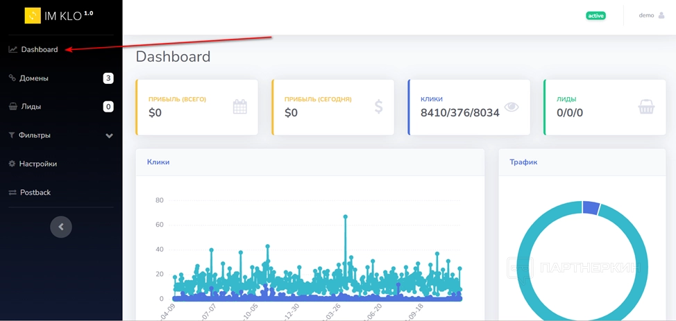• Dashboard. Основной экран, который отображает всю важную информацию: общую и сегодняшнюю прибыль, количество кликов, лиды. Также в виде графика можно проследить за количеством кликов черных и белых офферов, лидов и потоком трафика.