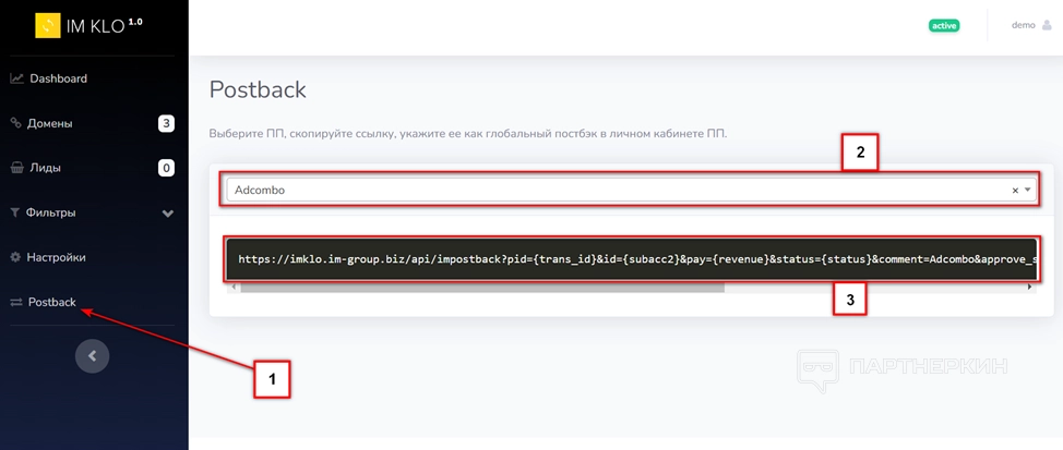 • Postback (1). Это инструмент, который позволяет получать наибольшее количество информации о трафике без входа в партнерку. Чтобы его настроить, нужно выбрать вид (2), скопировать ссылку (3) и вставить ее в соответствующее поле.