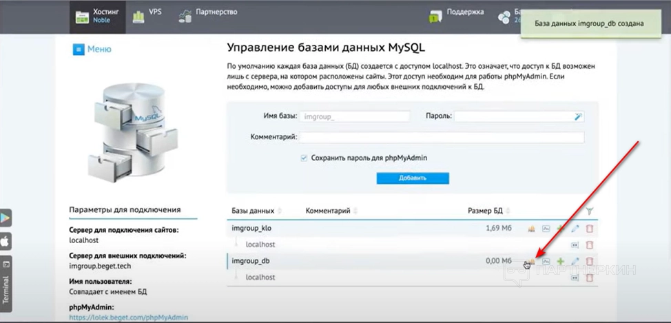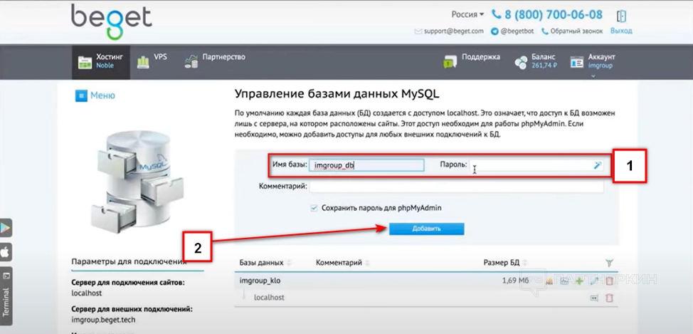 • Придумайте название базы данных и сгенерируйте пароль (1) и нажмите «Добавить» (2).