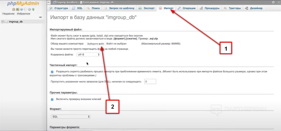 • Перейдите во вкладку «Импорт» (1) и нажмите на кнопку «Выберите файл» (2). Найдите базу данных с расширением .sql, который прислали после оплаты лицензии