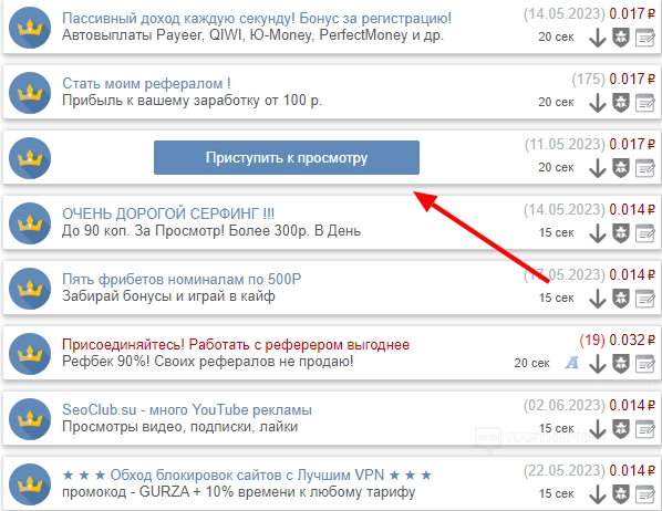 Здесь пользователь получает деньги за просмотр сайтов (большинство заданий представлены с временем 15 секунд). Чтобы заработать деньги, нужно нажать на любое предложение и кликнуть на «Приступить к просмотру».