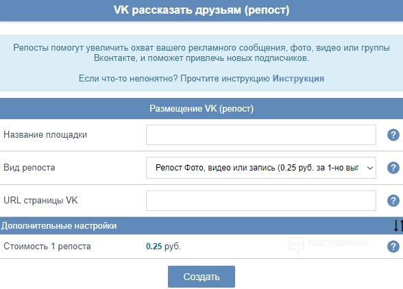 Рассказать друзьям (репост). Репосты помогут увеличить охват рекламного сообщения, фото, видео или группы «ВКонтакте», а также привлечет новых подписчиков. Пользователю нужно указать название площадки, URL страницы и выбрать вид репоста: