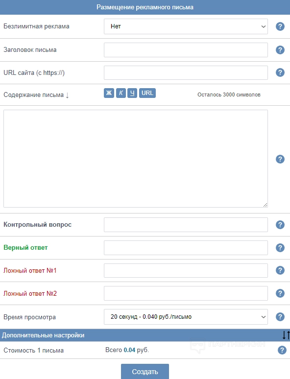 Рекламные письма — это возможность заинтересовать огромную аудиторию и привлечь их на рекламируемый ресурс. В письмах можно рассказать о преимуществах сайта и донести до читателя больше информации, чем при любой другой рекламной кампании. Форма размещения рекламного письма: