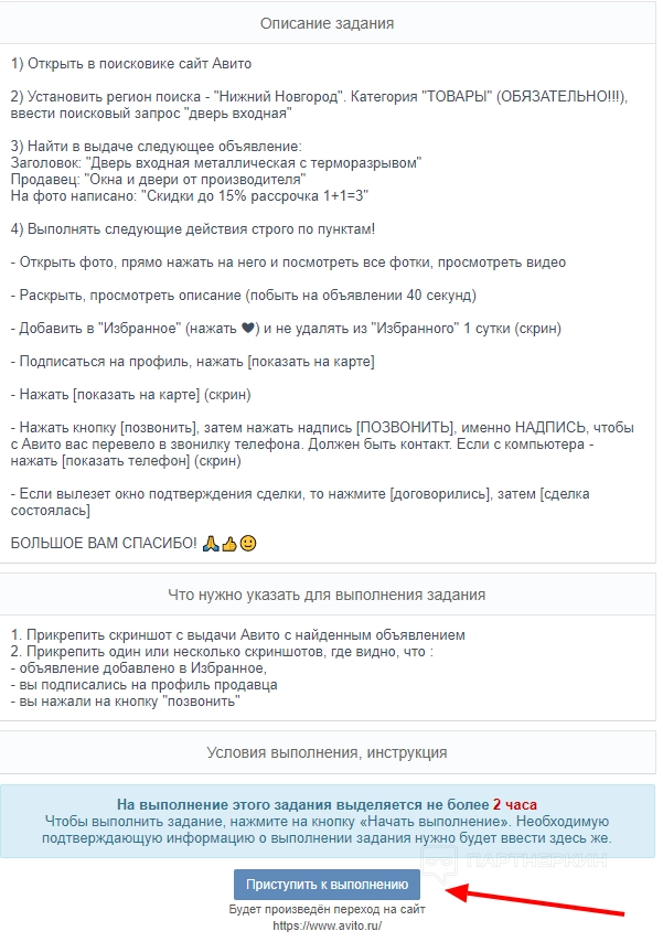 Чтобы перейти к описанию задания, необходимо кликнуть на него. На новой странице фрилансер ознакомится с условиями и инструкцией. Если исполнителя все устраивает, нужно кликнуть на «Приступить к выполнению».