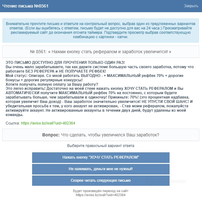 Вид заработка, связанный с просмотром сайтов. Перед их посещением фрилансеру потребуется прочитать рекламное сообщение (письмо) и ответить на контрольный вопрос.