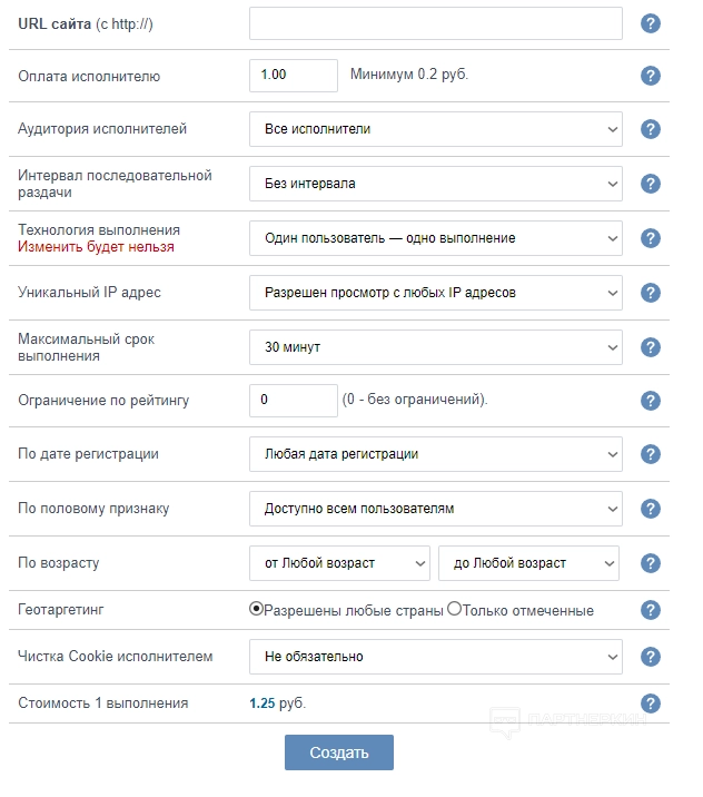 - Стоимость 1 выполнения. Сумма, которая спишется с баланса задания за одно выполнение.