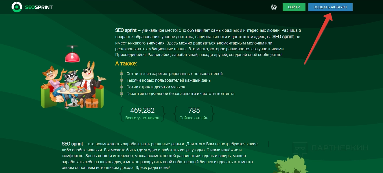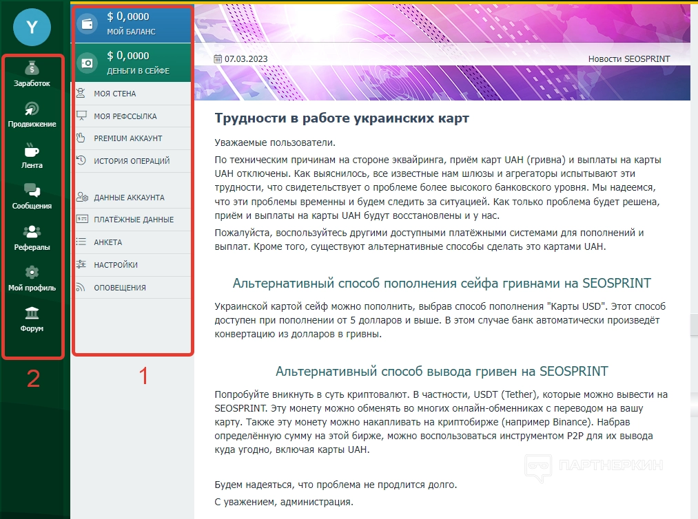 - Партнерская программа. Пользователи могут зарабатывать на привлечении новых пользователей в сервис Seosprint.