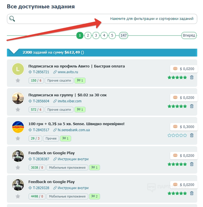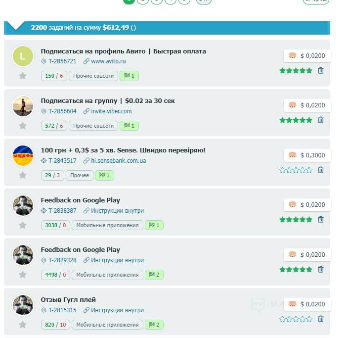 Перейдя в раздел «Заработок», вебмастер откроется страницу со всеми размещенными на сайте заказами. Заказы отображены в дашборде в виде карточек, в которых указаны название, ссылка на задание, отзывы, рейтинг и стоимость выполнения.